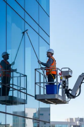 High-rise window cleaning requiring rope descent or suspended scaffolding